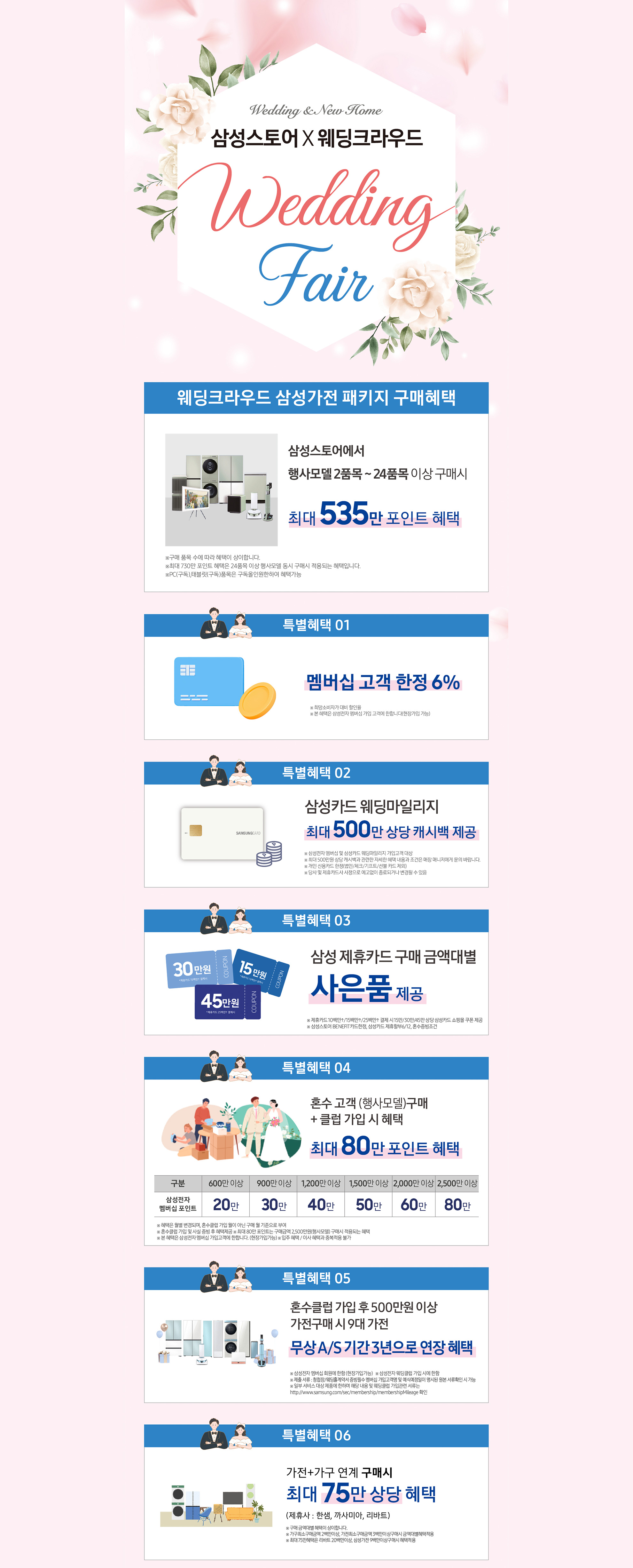 1. 개인정보 수집의 주체 웨딩크라우드 2. 개인정보 수집 및 이용목적 회사(웨딩크라우드)는 서비스 제공 및 고객지원을 위하여 개인이 식별 가능한 개인정보를 수집하며, 수집된 개인 식별 가능한 개인정보는 위 수집 목적 이외의 용도로는 사용되지 않습니다. 기타, 개별 개인을 식별할 수 없는 개인정보의 통계결과는 회사가 영업 및 기타 활동을 위하여 사용될 수 있습니다. 3. 개인정보의 수집 항목 이름, 성별, 휴대폰번호, 결혼예정일, 방문예정일, 입주일, 관심항목 4. 개인정보의 보유 및 이용기간 이용자의 개인정보는 개인정보의 수집목적 또는 제공받은 목적이 달성되면 파기하는 것을 원칙으로합니다. 또한 이용자 본인에 의한 가입해지와 개인정보 삭제 등의 요청 이전까지 회원정보를 보관합니다. 다만, 회사(웨딩크라우드)는 불량 회원의 부정한 이용의 재발을 방지하기 위해 일정기간동안 이용자의 개인정보를 보유할 수 있습니다. 개인정보 제3자 제공 동의 1. 개인정보를 제공받는 자 : 롯데하이마트 주식회사, 삼성전자판매㈜, LG전자 주식회사 2. 제공항목 : 이름, 성별, 휴대폰 번호, 예식일, 입주일, 관심항목 3. 이용목적 : 혼수 가전 제품 판촉 관련 TM/MMS 업무 시행 4. 보유 및 이용기간 : 10개월 개인정보 제3자 제공 동의2 1. 개인정보를 제공받는 자 : 디비생명보험(주), (주)아크미소프트, (주)한샘, (주)헬스엔소통 2. 제공항목 : 이름, 성별, 휴대폰 번호, 예식일, 입주일, 관심항목 3. 이용목적 : 홍보 및 서비스 판매 관련 TM/MMS 업무 매행 4)보유 및 이용기간 : 1년 ※ 귀하께서는 귀하의 개인정보를 제3자에게 제공하는 것에 대한 동의를 거부하실 수 있으나, 이는 TM 등 서비스 제공에 필수적인 제공이므로, 동의를 거부하실 경우 서비스 이용 등이 제한됩니다. 본인은 위와 같이 본인의 개인정보를 제3자에게 제공하는 것을 동의합니다. ※ 위 사항에 대한 동의를 거부할 수 있으나, 이에 대한 동의가 없을 경우 관련 편의 제공에 일부 제한이 있을 수 있습니다